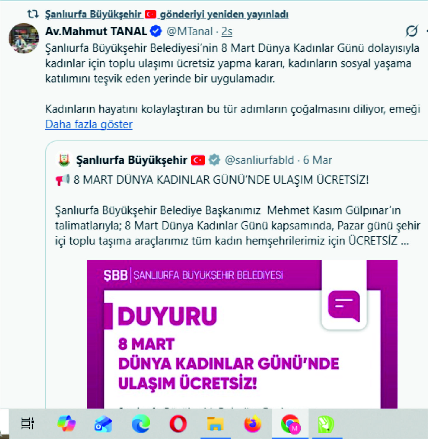 Şanlıurfa Büyükşehir Belediyesi, Başkan Mehmet Kasım Gülpınar'ın talimatıyla ilk kez flaş bir karar alarak 8 Mart Dünya Kadınlar Günü'ne özel toplu taşıma hizmetlerini bir günlüğüne ücetsiz yaptı. Uygulamadan memnunluk duyanlar arasında Cumhuriyet Halk Partisi (CHP) Şanlıurfa Milletvekili Mahmut Tanal da vardı. Sosyal medya hesabında Büyükşehir'i zaman zaman eleştirmesiyle bilinen Tanal, ''Şanlıurfa Büyükşehir Belediyesi’nin 8 Mart Dünya Kadınlar Günü dolayısıyla kadınlar için toplu ulaşımı ücretsiz yapma kararı, kadınların sosyal yaşama katılımını teşvik eden yerinde bir uygulamadır. Kadınların hayatını kolaylaştıran bu tür adımların çoğalmasını diliyor, emeği geçenleri kutluyorum'' ifadelerini paylaştı. Tanal'ın bu teşekkürü Büyükleri Belediyesinin x hesabında paylaşıldı.Tanal'a ait bu paylaşımla ilk kez Şanlıurfa Büyükşehir Belediyesi'nin sosyal medya hesabında karşılaşanlar kısa süreli bir şaşkınlık yaşadı.